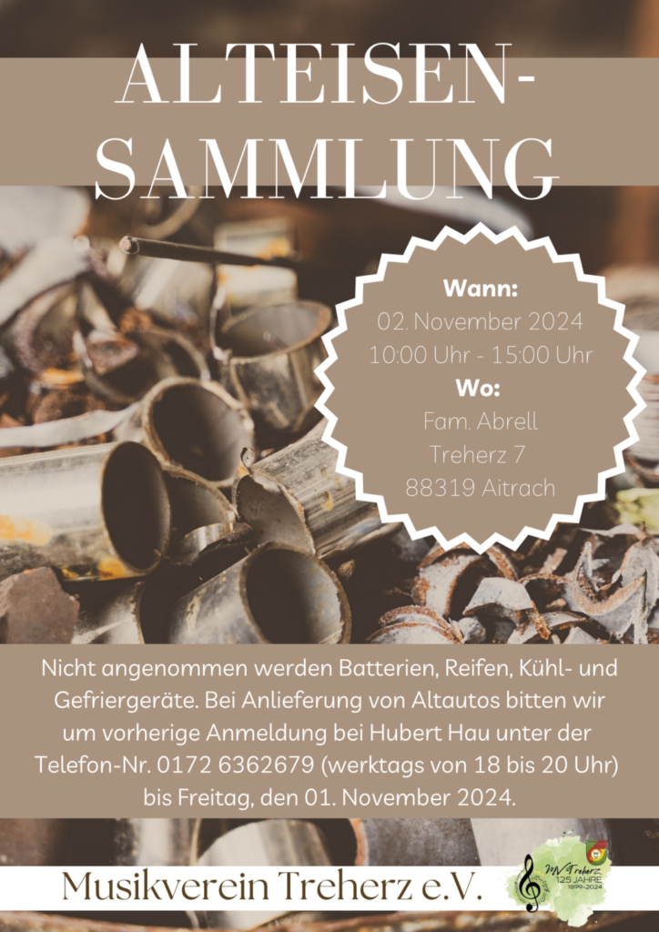 Treherz – Der Musikverein Treherz e.V. organisiert wieder die Alteisensammlung bei Familie Abrell. Nähere Informationen auf nachstehendem Flyer.