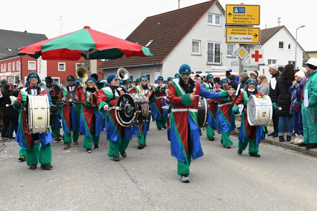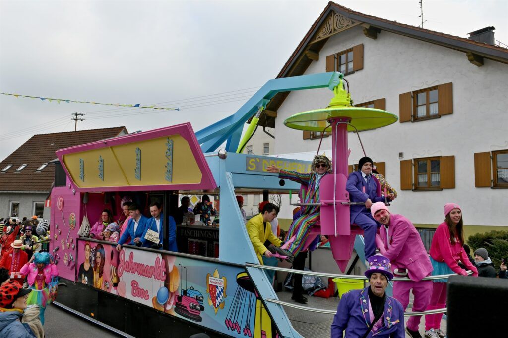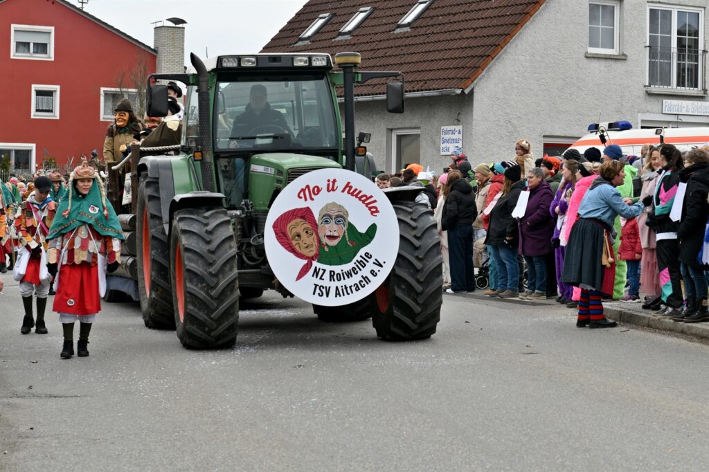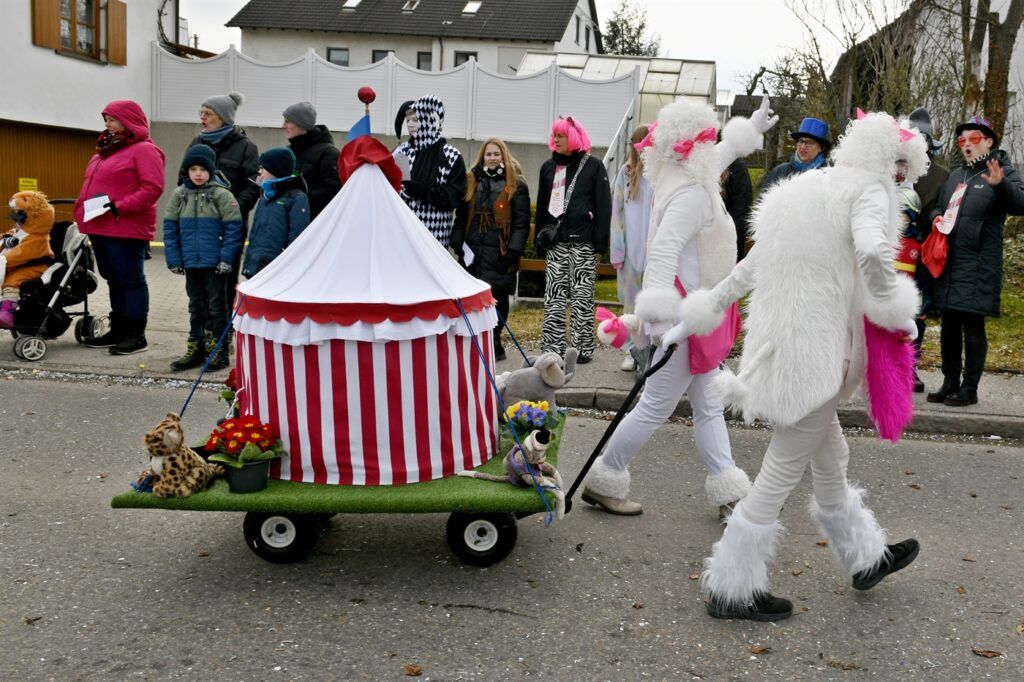 Höhepunkte und absolute Hingucker beim Aitracher Gaudiwurm waren die heimischen Fußgruppen und Wagenbauer, welche die Zirkuswelt, aber auch aktuelle politische Themen der Gegenwart in Stadt und Land bunt und fantasievoll präsentieren. Die Musikkapelle der Teilgemeinde Treherz führte den Zug an, gefolgt von den Aitracher Narrenzunftgruppen Roi- und Kellaweible, den Prinzenpaaren Florentine und Andreas und Laura und Jakob sowie den Gardemädchen.