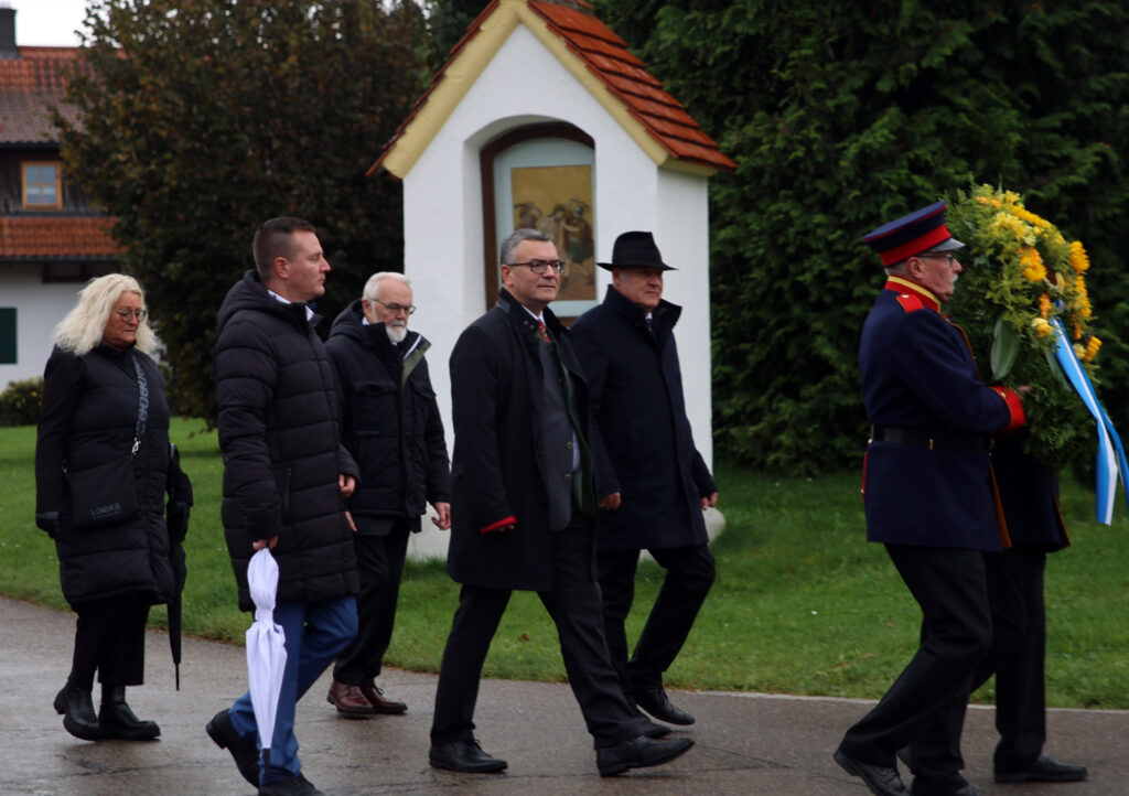 Ein zentraler Punkt der Wallfahrt war die feierliche Gefallenenehrung am Kriegerdenkmal. Hier hielt Dr. Florian Herrmann, Staatsminister und Leiter der Bayerischen Staatskanzlei, eine bewegende Gedenkansprache. Herrmann betonte die Bedeutung des Erinnerns an die Opfer von Krieg und Gewalt und rief dazu auf, Frieden und Versöhnung in der Gesellschaft zu fördern. Zu Ehren der Gefallenen legten Staatsminister Herrmann, Bürgermeister Franz Abele (Legau) und Norbert Endres, Vorsitzender der Bayerisch-Württembergischen Kriegervereinigung, einen Kranz nieder. Begleitet wurde die Zeremonie von Salutschüssen und dem Lied „Ich hatt’ einen Kameraden“, das für viele Anwesende einen besonders bewegenden Moment darstellte.