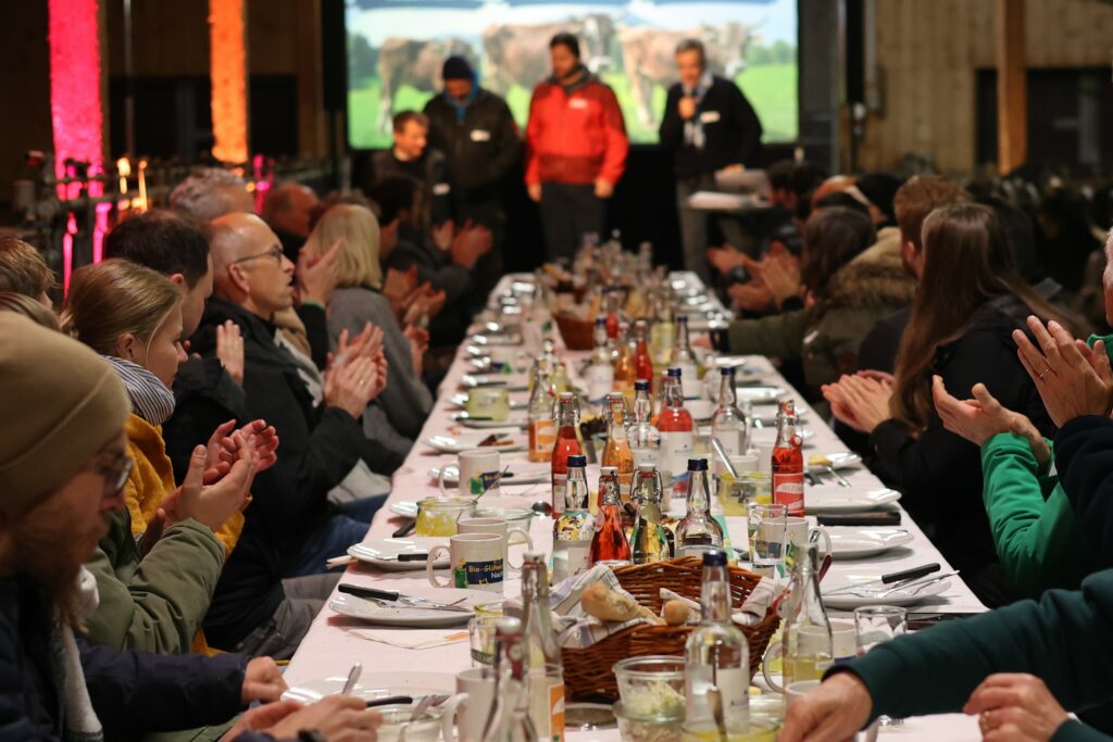 Weißgedeckte Tafel im Kuhstall: Die Kühe sind mit bestem Heu beschäftigt, die Gäste mit regionalen Produkten.