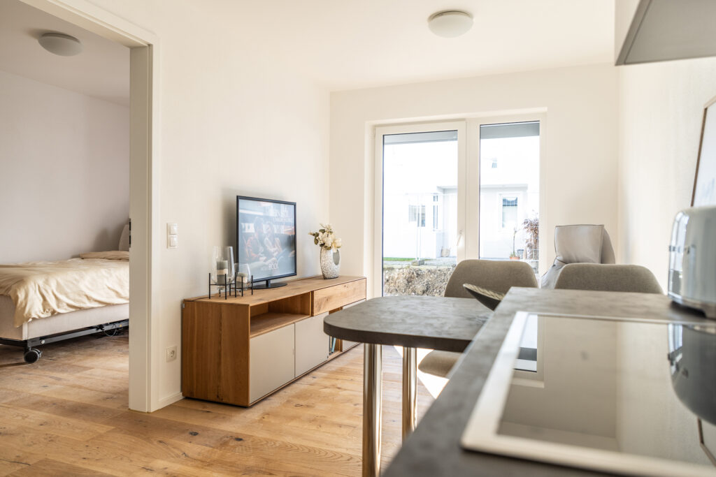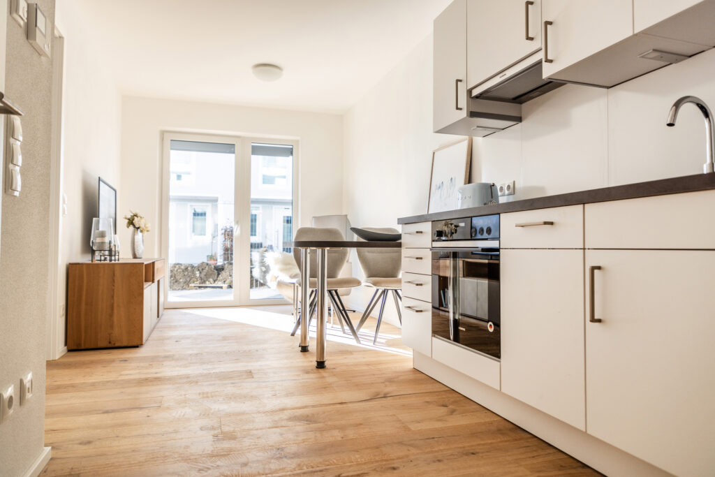 Die Wohnanlage „Leben am Flößerpark“ bietet dank des großen Gemeinschaftsraums in einem der drei Häuser einen Ort für Begegnung. „Ähnlich wie der gute, alte Stammtisch ist der Gemeinschaftsraum inklusive Terrasse Treffpunkt für alle Bewohnerinnen und Bewohner und Anlaufstelle für Unterhaltungen und Aktivitäten“, so Josef Staller. Die Wohnungen wiederum bieten Raum für Ruhe und Rückzug. Für ein Plus an Sicherheit sorgt das Konzept des Service-Wohnens obendrein, beispielsweise durch die Bereitstellung des Hausnotrufs von Illersenio.