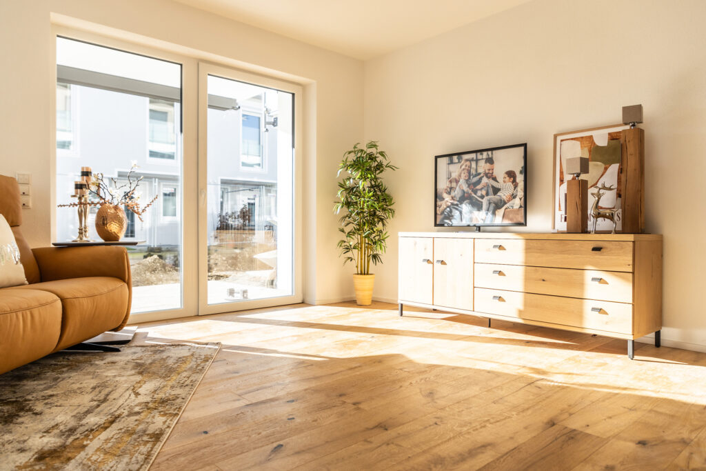Bodentiefe Fenster sorgen für viel Licht in den barrierefreien Wohnungen, wie hier im Ess- und Wohnraum. Foto: Max Wild
