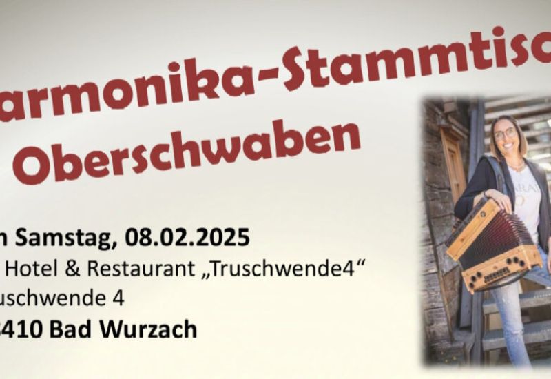 Bad Wurzach – Claudia Herdrich, bekannt für ihr schönes Spielen mit der Steirischen Harmonika, lädt am Samstag, 8. Februar, zu einem Harmonika-Stammtisch ins Restaurant T4 in Truschwende.