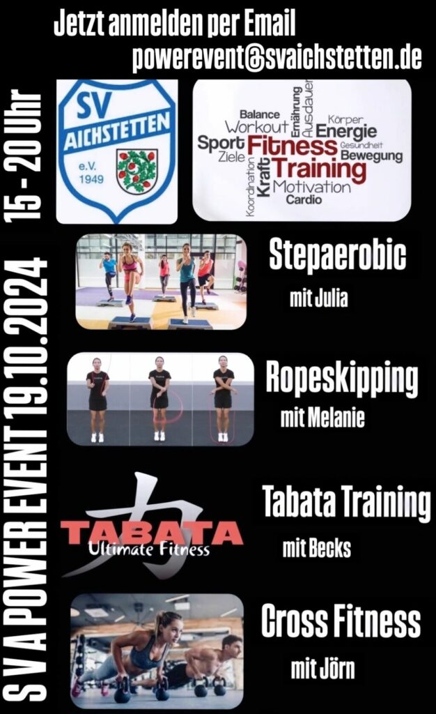 Aichstetten – Der Sportverein Aichstetten bietet am 19. Oktober ein sogenanntes Powerevent an. Zu den Fitnessangeboten kann man sich ab sofort anmelden. Das Powerevent findet im Rahmen des Jubiläumsjahres 2024 statt, in dem der SVA 75-jähriges Bestehen feiern. Infos zum Powerevent auf nachstehend veröffentlichtem Flyer: