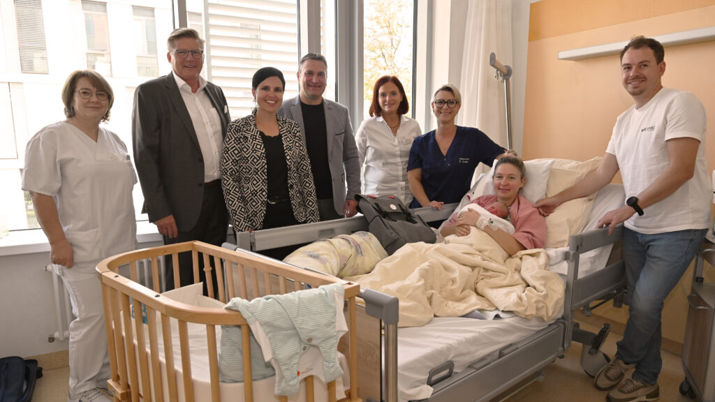 Mit der Familie freuen sich: Stationsleiterin Maria Bartha, Michael Gresens, Mitglied des erweiterten Vorstands der Kreissparkasse Ravensburg, Anna-Lena Seitz, Marketingreferentin der Kreissparkasse, der kaufmännische Direktor der OSK Ulrich Hornstein, Chefärztin Dr. Martina Gropp-Meier und Hebamme Doris Grothe (von links).