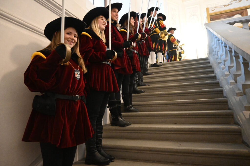Auf der Treppe zum Marmorsaal im gräflich-königseggschen Schloss zu Aulendorf präsentierten die Gardemädels neben ihren Schwertern ihr schönstes Lächeln. Und oben an der steilen Treppe angekommen, drängten sich die Ehrengäste dicht an dicht.