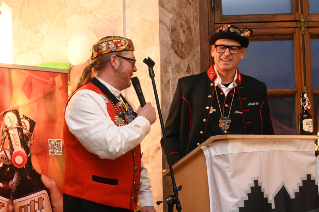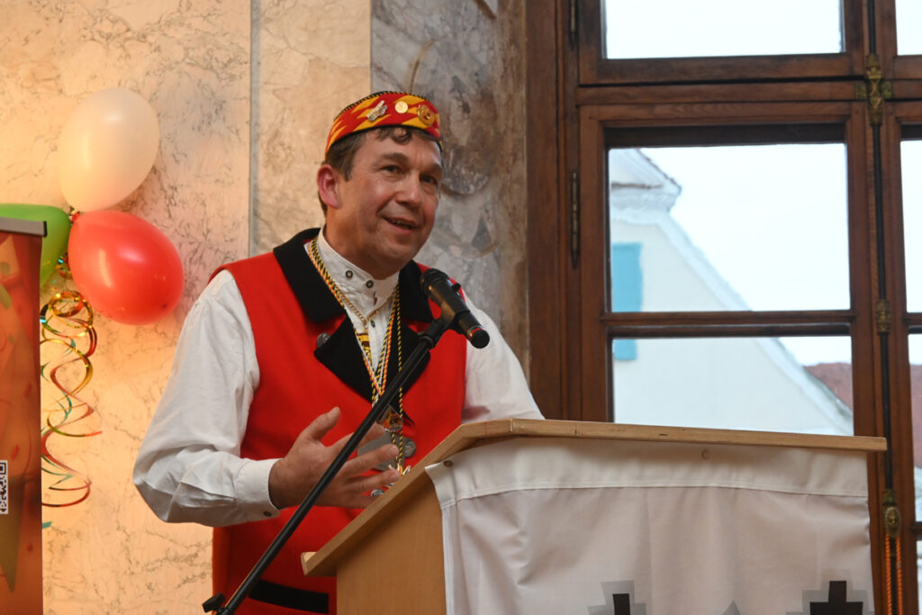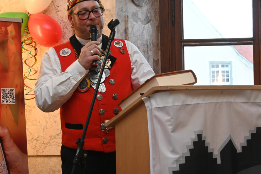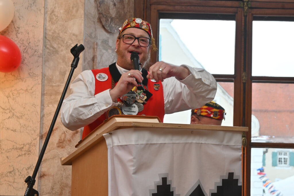 Thomas Kohler als Vertreter der Landschaft Oberschwaben-Allgäu im VSAN war der Nächste im Reigen der Grußworte. Auch er hatte ein paar Reime mitgebracht: „Es ist schon überall bekannt im ganzen Oberschwabenland, dass in Aulendorf zur Fasnetszeit am närrischsten ist weit und breit. Dort singt man immer wieder die schönsten Schunkellieder. Aulendorf zur Fasnetszeit bringt Lebenslust und Fröhlichkeit. Lieder, Liebe und der Wein, das soll heut auch unser Motto sein. Heiterkeit und Jubel, Fasnetstrubel.“