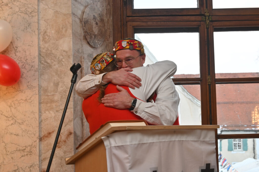 Als Micha Weißenrieder bei der Mikroübergabe von seinem Besuch am Grab des Ehrenzunftmeisters Klaus Wekenmann erzählte, wurde es ganz emotional und die beiden Obernarren mussten sich die eine oder andere Träne verdrücken. Lange lagen sich „die Brüder“, wie es Flo Angele ausdrückte, in den Armen.