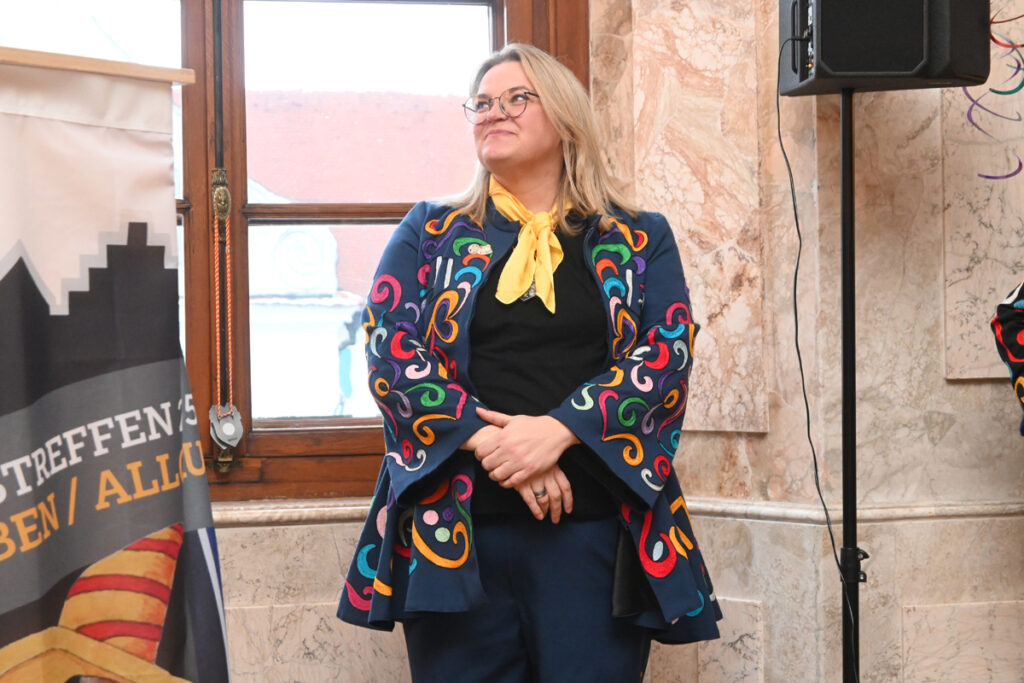 Micha Weißenrieder bedankte sich bei allen Sponsoren, die das Landschaftstreffen großzügig unterstützten. 60.000 Euro konnte die Narrenzunft einsammeln, die zur Organisation des Treffens verwendet wurden. Ohne Sponsoren und ohne die ehrenamtlichen Helfer wäre die Organisation eines solchen Ereignisses nicht möglich. Aber die Zunft wurde nicht nur mit Geldspenden unterstützt. „Wenn wir gekommen sind und um einen Gabelstapler oder eine andere Hilfe baten, wurde die immer gerne gewährt. Ein Nein bekamen wir nie zu hören. Da gilt der Spruch: „I bin an Auledorfer, i bin was bsonders.“ Dann rief er Vanessa Rösch nach vorne. „Wir haben keine teure Werbeagentur. Alle Werbemaßnahmen rund um die Zunft und das Landschaftstreffen hat Vanessa gestaltet. Und wenn mir in der Nacht noch was eingefallen ist, rief ich bei Vanessa an und am nächsten Morgen zeigte sie mir schon die ersten Entwürfe.“ Dafür bekam Vanessa auch den Jahresorden verliehen.