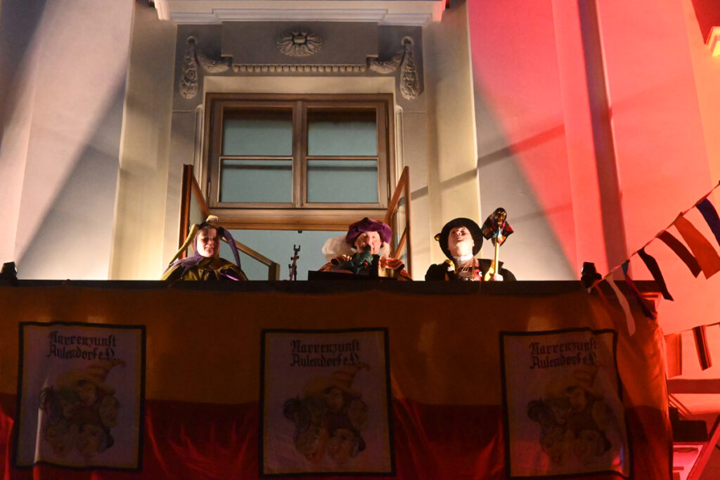 Bürgermeister Matthias Burth trug seine Begrüßung in Versen vor. „Willkommen Freunde, Groß und Klein, heute lädt Aulendorf zur Fasnet ein …ob Narrensprung, ob Umzug groß, die Aulendorfer Fasnet, die ist famos … drum lasst uns singen, tanzen lachen, das Narrenspiel heut lebendig machen, ein Hoch auf uns, auf euren Brauch, auf Fasnetsgeist mit Herz und Bauch“.