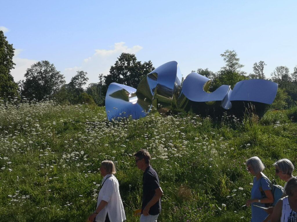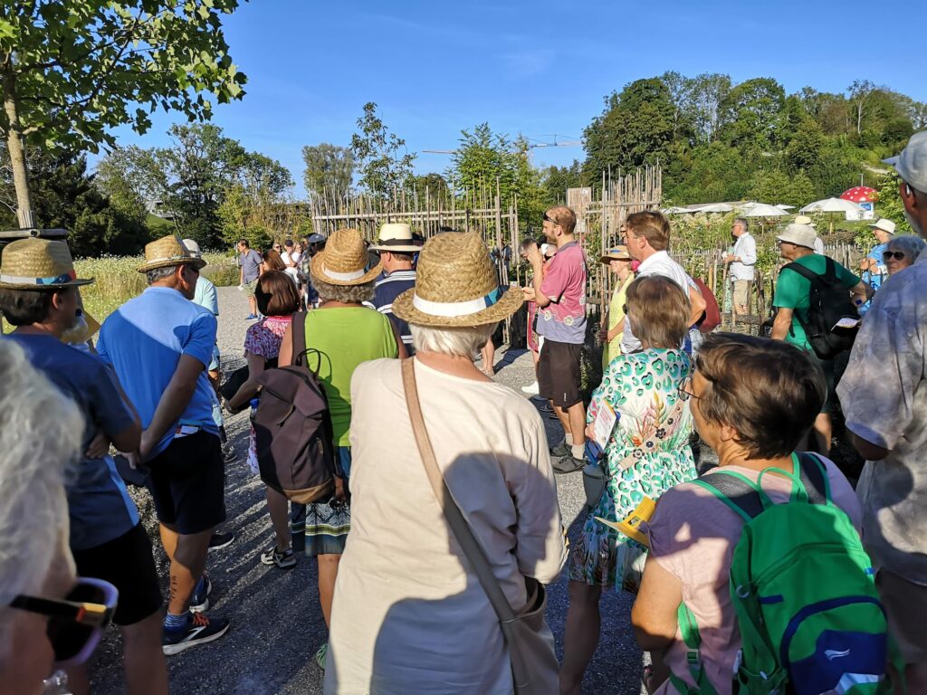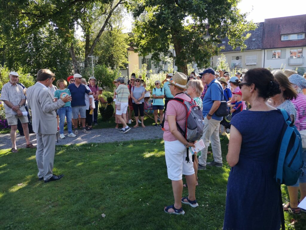 Wangen – Am letzten Dienstag (6.8.) herrschten auch am Spätnachmittag noch hochsommerliche und durchaus schweißtreibende Temperaturen. Trotzdem hatten sich über 100 bestens gelaunte Besucher eingefunden, um bei einem von Oberbürgermeister Michael Lang beschwingt moderierten Gang über das Gelände der Landesgartenschau die dort gezeigten Kunstwerke zu würdigen.