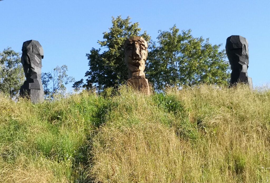 Auch für die drei Köpfe von Klaus Prior würde man sich wünschen, sie könnten auf Dauer auf ihrem imposanten Platz verbleiben. Bei ihnen handelt es sich um unterschiedlich patinierte Bronzeabgüsse einer von dem Künstler, der lange in Kißlegg gearbeitet hat, ursprünglich aus Holz geschnitzten Form. Wie die berühmten urzeitlichen Monumentalköpfe auf den Osterinseln scheinen die drei Skulpturen auf einem steilen Hügel gleichsam über das Gelände der Gartenschau zu wachen.