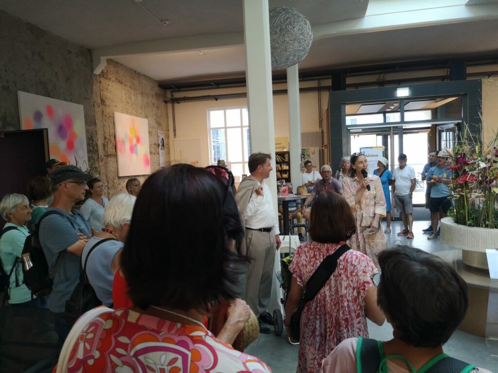 Das große Interesse an der Veranstaltung hatte nicht nur damit zu tun, dass der OB und Reiner Fritz von der Städtischen Galerie im Badhaus, der die Ausstellung maßgeblich mit vorbereitet hatte, das Konzept erläuterten. Es kam dazu, dass die Hälfte der auf dem Gelände vertretenen 14 Künstler extra zu dieser Veranstaltung angereist war und bereitwillig zu ihren Arbeiten Auskunft gab. Bei dem Rundgang wurden sämtliche 13 Skulpturen besucht und besprochen, bevor die Veranstaltung dann im Blütencafé auf dem ERBA-Gelände endete, wo großformatige Malerei von Margit Hartnagel gezeigt wird.