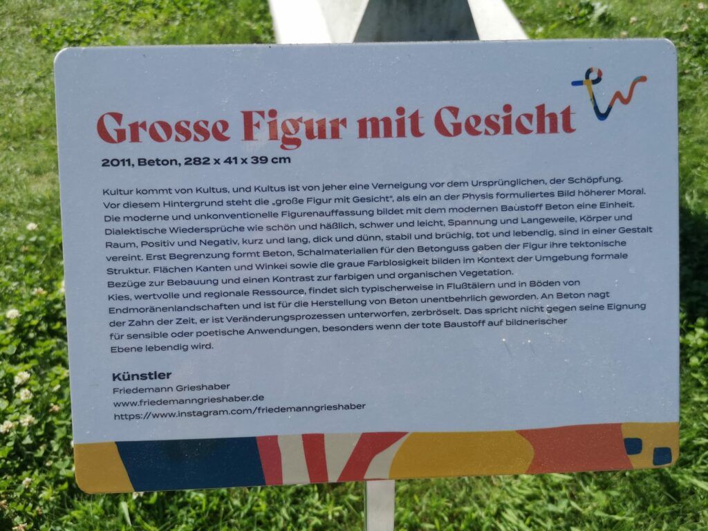 „Große Figur mit Gesicht“ heißt wenig weiter Friedemann Grieshabers hoch aufragende Arbeit, die etwas von einer Kultfigur aus fernen Zeiten hat. Der Künstler erläutert, dass für ihn die Verwendung des ganz und gar un-klassischen Materials Beton und eine eben bewusst nicht-naturalistische Auffassung der menschlichen Figur zwingend zusammengehören. Auch Guido Weggenmanns „Tanksäule“ sieht aus der Ferne wie ein Kultobjekt aus, nämlich wie ein Totem- oder Marterpfahl der nordamerikanischen Indianer. Tritt man näher, erkennt man, dass hier stählerne Wasserkanister zusammengefügt wurden. Nach Auskunft des Künstlers wurden sie von der Bundeswehr in Nordafrika verwendet und sollen hier nun auf die Gefährdung der Ressource Wasser verweisen.
