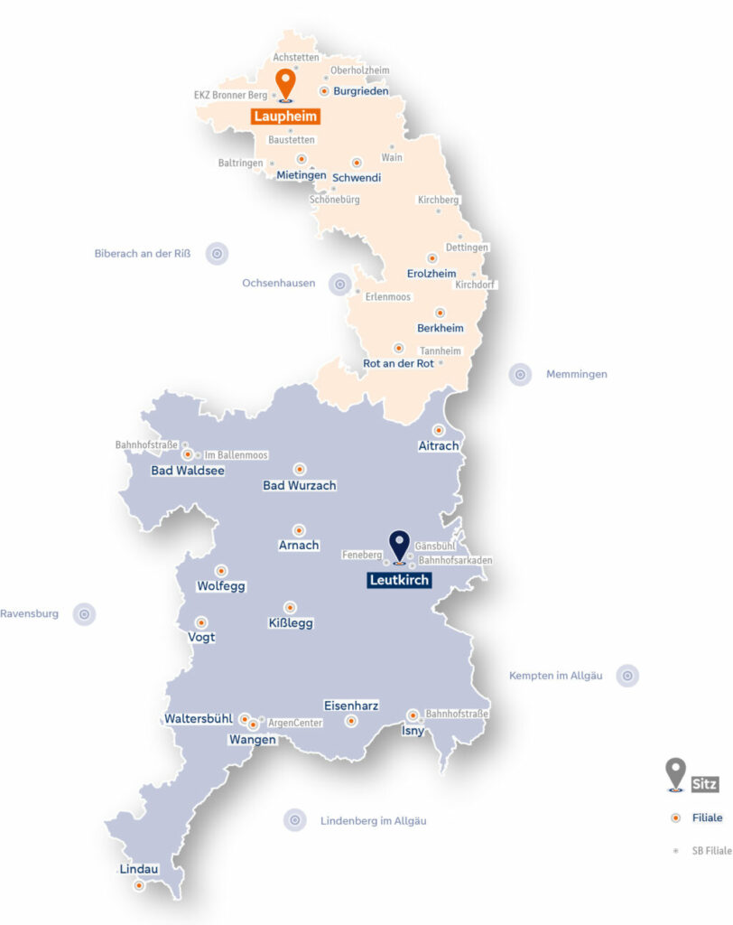Die neue Bank, deren Geschäftsgebiet von Lindau im Süden bis Achstetten bei Laupheim im Norden und von Leutkirch im Osten bis Bad Waldsee im Westen reicht, hat 20 Filialen und zusätzliche 19 SB-Filialen. Die beiden bisherigen Geschäftsgebiete überlappen sich nicht. Da es sich quasi um eine territoriale Addition handelt, wird es bei der Zahl der Filialen „keine fusionsbedingte“ Reduzierung geben, betonte Vorstand Werner Mayer auf Nachfrage der Bildschirmzeitung. Man sei „glücklich über die Situation, wie sie es ist“ und sehe „keinen aktuellen“ Handlungsbedarf, zumal eine Bereinigung in der Fläche in den vergangenen Jahren stattgefunden habe. Letztlich läge es an der jeweiligen örtlichen Besucher-Frequenz, ob eine Filiale auf Dauer Bestand habe. Mayer: „Die Kunden haben es in der Hand.“
