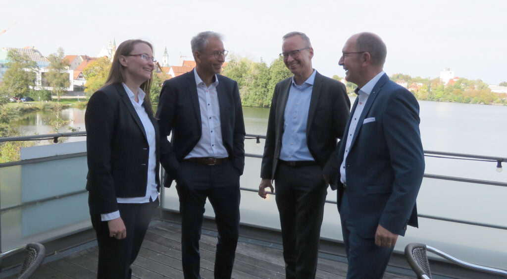 Der künftige gemeinsame Vorstand, bestehend aus Josef Hodrus und Werner Mayer von der Voba Allgäu-Oberschwaben (VBAO) sowie Markus Langner und Stephanie Bernickel von der Volksbank Raiffeisenbank Laupheim-Illertal (VRLI), informierte in Bad Waldsee über den aktuellen Stand des Aufeinanderzugehens. Hodrus wird künftig als Sprecher des Vorstandes fungieren – vorausgesetzt, die Gremien werden der Fusion zustimmen. Alle vier zeigten sich überzeugt von der zukunftsgerichteten Entwicklung, die die Bank „wetterfest“ (Hodrus) macht in Zeiten eines massiven Strukturwandels in der Branche. Beide Seiten betonten die wirtschaftliche Solidität ihrer Institute. Langner (VRLI) sagte, „wir müssen nicht heiraten, wir wollen es“. Aus dieser Bemerkung ergab sich bei der Pressekonferenz im Haus am Stadtsee ein lockerer Plausch zwischen den Bankleuten und den Medienleuten, die in dem Apercu gipfelten: Es ist keine Liebesheirat, aber eine Vernunftheirat.