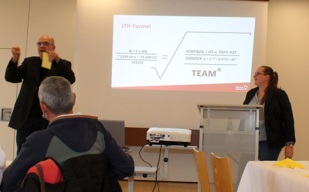 Lisa Schneider und Bernd Wiggenhauser von der Mitarbeitervertretung haben zunächst um die richtige Bezeichnung für die Personen gerungen, die letztes Jahr in den Ruhestand getreten sind: Rentner, Senioren, Ehemalige oder gar SGB VI Anspruchsberechtigte? Tatsache ist aber, dass man ihr Wirken weiterhin spüre und der Austausch und die Erfahrungen wichtig seien. In einer komplizierten mathematischen Formal wurde berechnet, was das Team der Liebenau Teilhabe ausmacht. Dabei wurden 2550 Dienstjahre mit 76500 Urlaubstage verglichen, die Wurzel gezogen und multipliziert, am Ende war es aber ganz einfach. Der gute Zusammenhalt im Team!