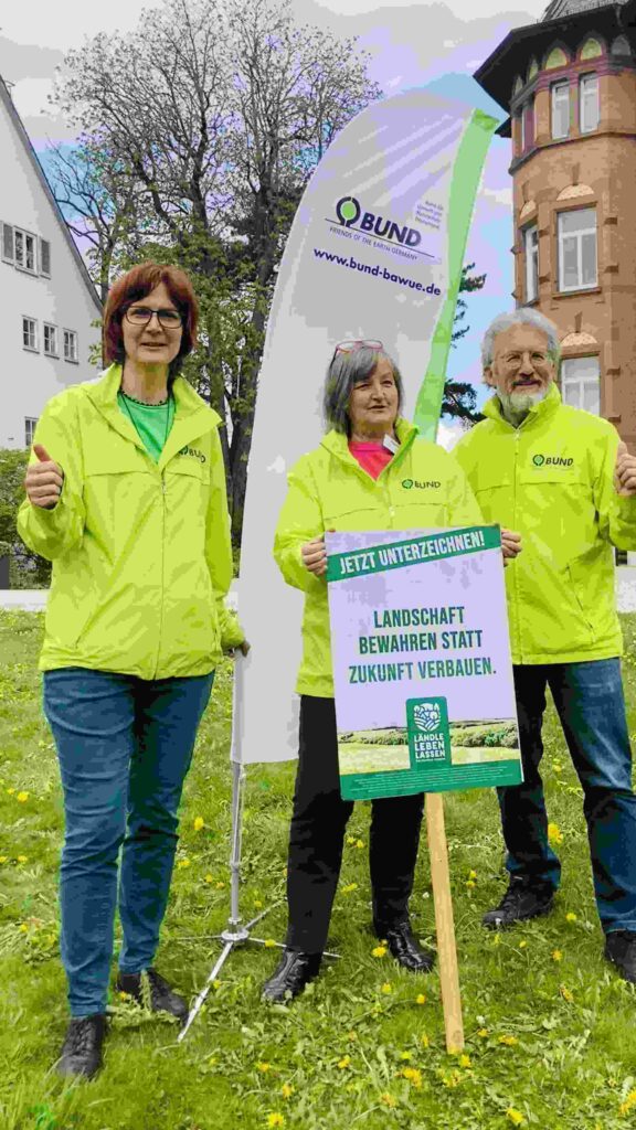 Kati Kästner, Irmgard Vögtle-Laub und Bruno Sing vom BUND-Aulendorf werben für die Unterschriftenaktion „Ländle-Leben-Lassen“. Foto: BUND-Aulendorf