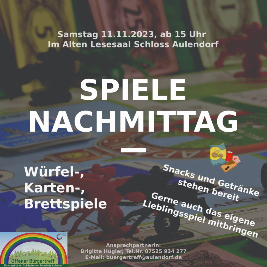 Aulendorf (dbsz) – Der Offene Bürgertreff lädt am Samstag, 11. November, um 15.00 Uhr zum Spielenachmittag im Alten Lesesaal im Schloss ein.
