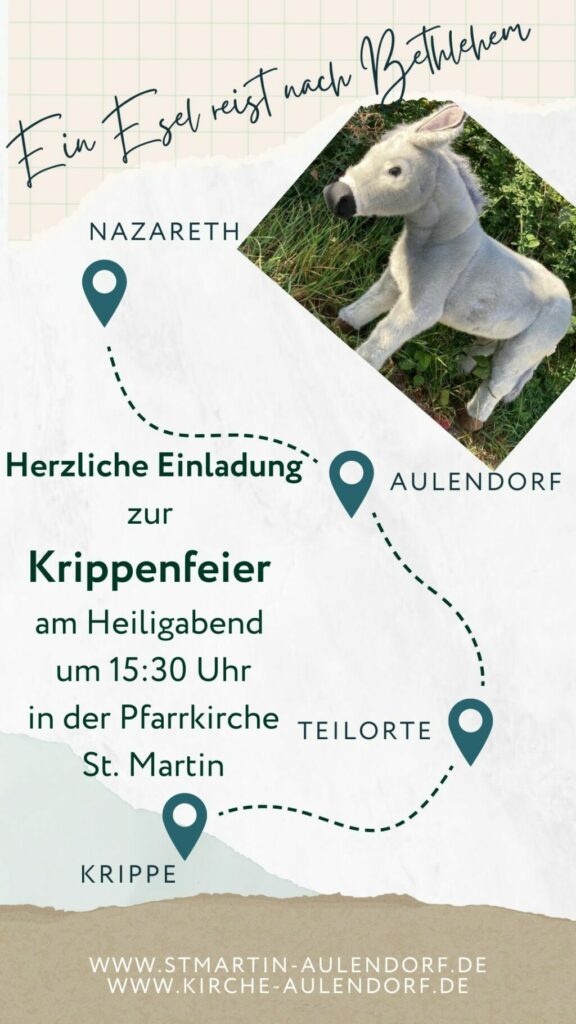 Am Heiligen Abend lädt die Pfarrgemeinde St. Martin unter dem Leitwort „Ein Esel reist nach Bethlehem“ zur Krippenfeier in die Pfarrkirche ein. Beginn ist um 15.30 Uhr.