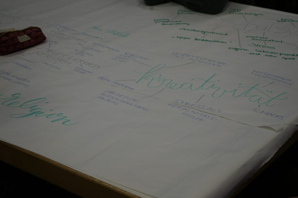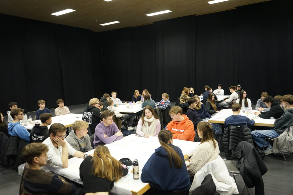 Der Vormittag war als Besinnungstag gestaltet unter dem Motto „Die Kunst zu glauben und die Kunst, ein kreatives Leben zu führen“. Dazu verwandelte David Bösl die Kulturhalle in ein „World-Café“, um eine anregende Gesprächsatmosphäre zu fördern. In diesem Rahmen reflektierte die Jahrgangsstufe II über Inspirationen zu Glauben und Kreativität, die sie in St. Johann erhalten haben. Außerdem gab es auch Raum für Selbstreflexion und Kreativität im Blick auf den Weg vom Jugendlichen zum Erwachsenen.