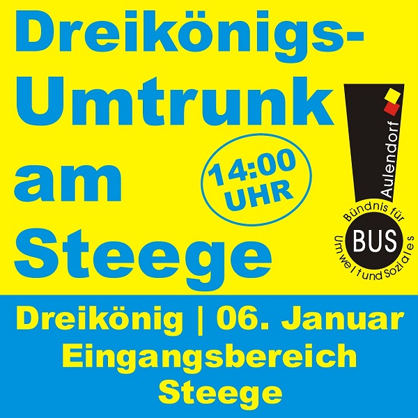 Aulendorf – Am kommenden Samstag, dem Dreikönigstag, laden der BUS e.V. und die BUS-Gemeinderatsfraktion ab 14.00 Uhr zum traditionellen Umtrunk am Eingangsbereich des Steegersees ein. Das Wetter zeigt sich wohl wechselhaft. Dagegen gibt es Glühwein, Punsch und Feuerschale.