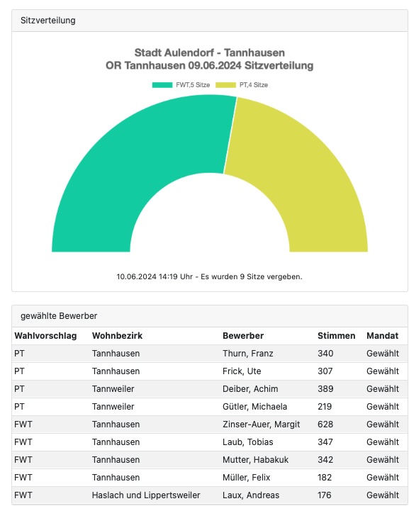 Tannhausen (rei) – Neun Mitglieder hat der Ortschaftsrat Tannhausen. Stimmenkönig ist Franz Thurn; auf ihn entfielen 340 Wählervoten. Auf Platz zwei rangiert Ute Frick (307 Stimmen). Nachstehend das Ergebnis der Ortschaftsratswahl von Tannhausen, entnommen der Webseite der Stadt Aulendorf: