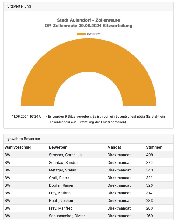 Zollenreute (rei) – Neun Mitglieder hat der Ortschaftsrat Zollenreute. Stimmenkönig ist Cornelius Strasser; auf ihn entfielen 409 Wählervoten. Auf Platz zwei rangiert Sandra Sonntag (370 Stimmen). Nachstehend das Ergebnis der Ortschaftsratswahl von Zollenreute, entnommen der Webseite der Stadt Aulendorf: