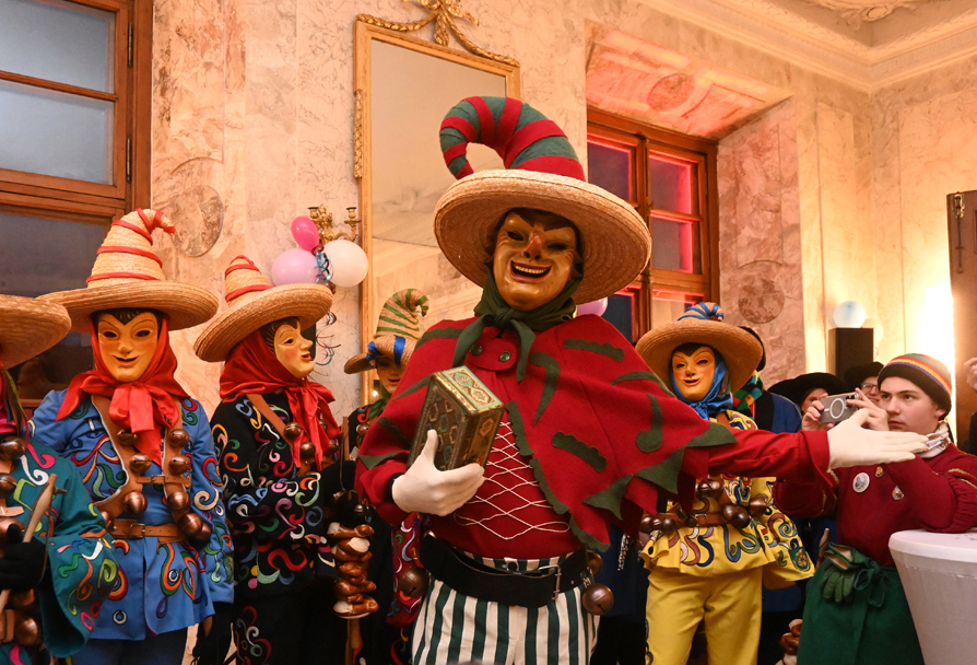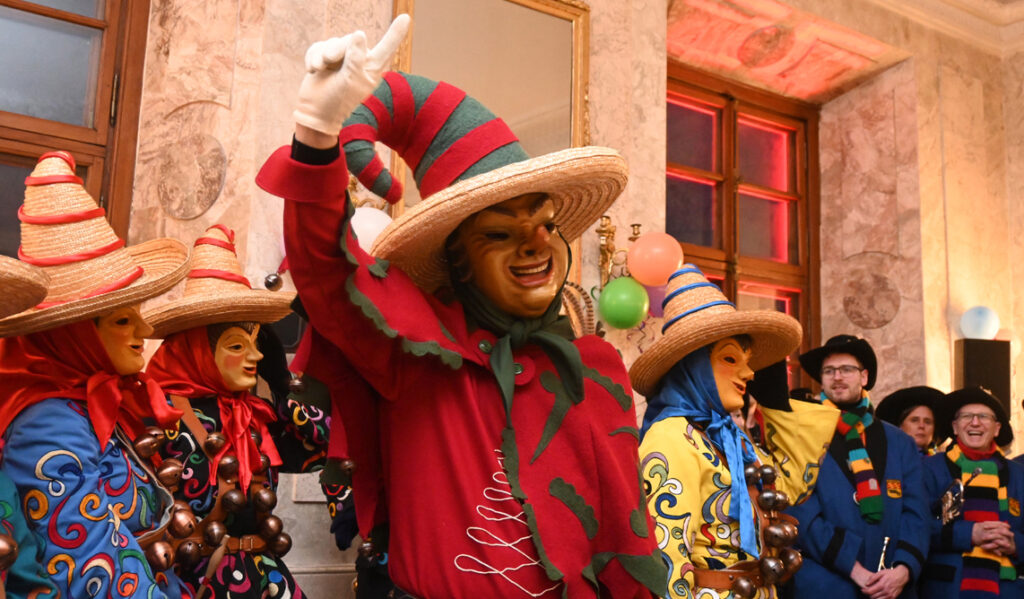 Nur der Hut des Schellenschnörkels fand Eingang in die Schnörkeles-Gestaltung. Der einmalige Schellenschnörkel trat beim Empfang auf und wird auch den Umzug am Sonntag begleiten.