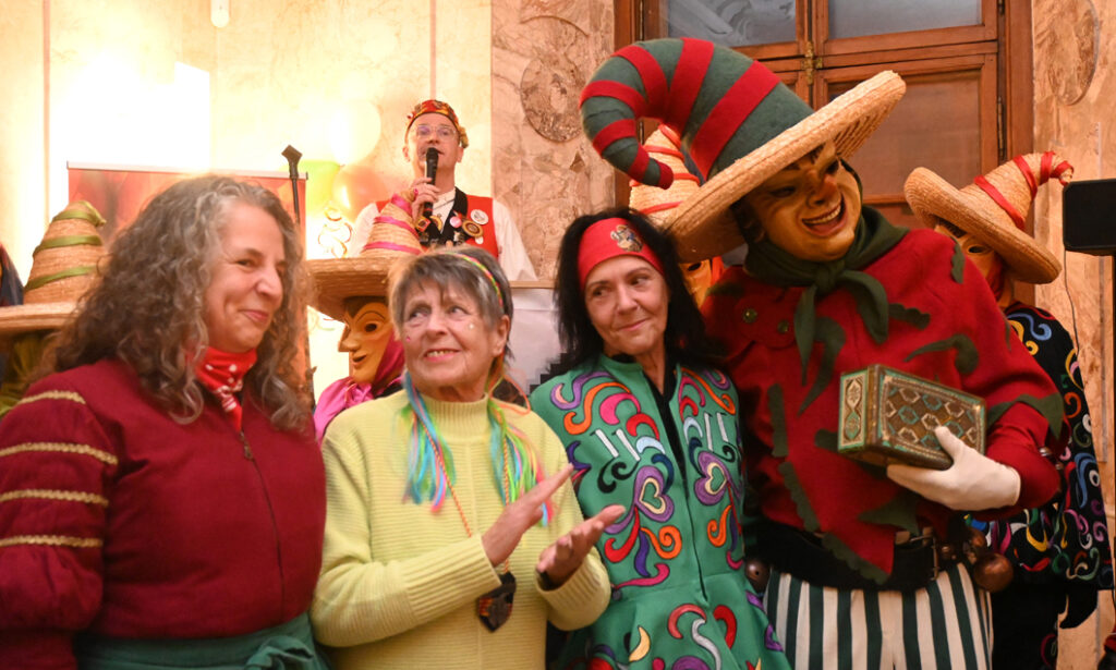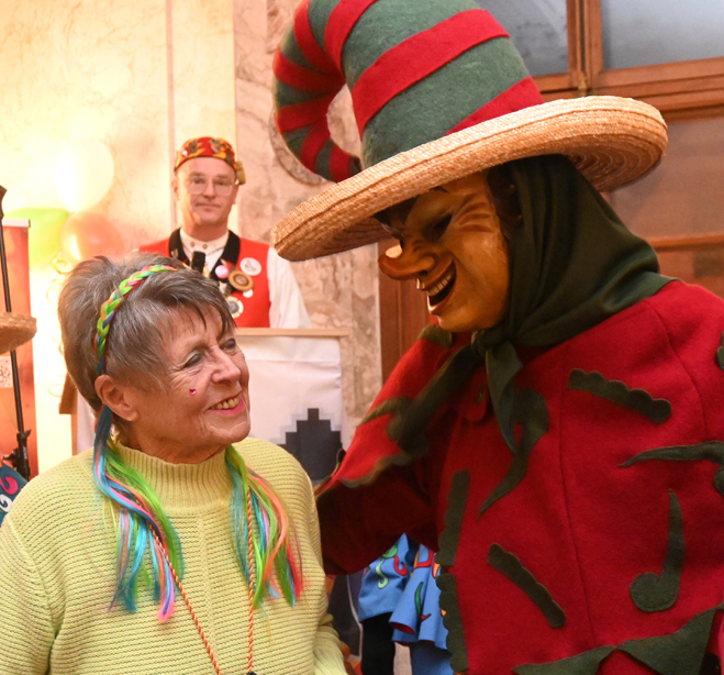 Hedi Kaiser, die Hüterin des Fasnetsschatzes, gab die einmalige Maske nun als Dauerleihgabe an die Zunft, in deren Namen sich Michael Weißenriedfer herzlich bedankte und zeichnete sie schon im Vorfeld mit dem Orden des Landschaftstreffens aus.