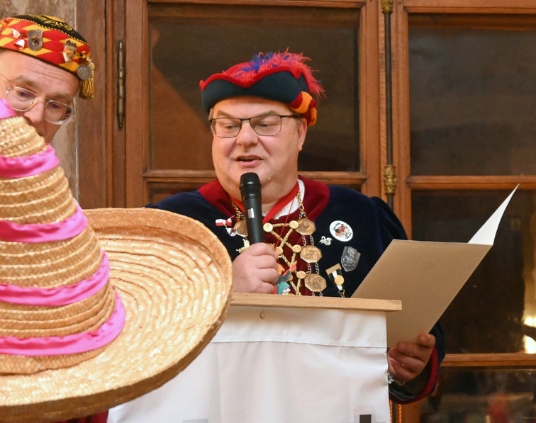 Sie haben die Maske von 1949 reaktiviert (von links): Christine Ramm, Hedi Kaiser, Siggi Frick mit Schellenschnörkel. Hinten am Rednerpult Michael Weißenrieder.
