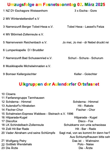 Aulendorf – Die Bildschirmzeitung wünscht Aulendorf eine glückselige Fasnet. Nachstehend ein Ausblick auf den Fasnetssonntig, entnommen der Webseite der Narrenzunft Aulendorf: