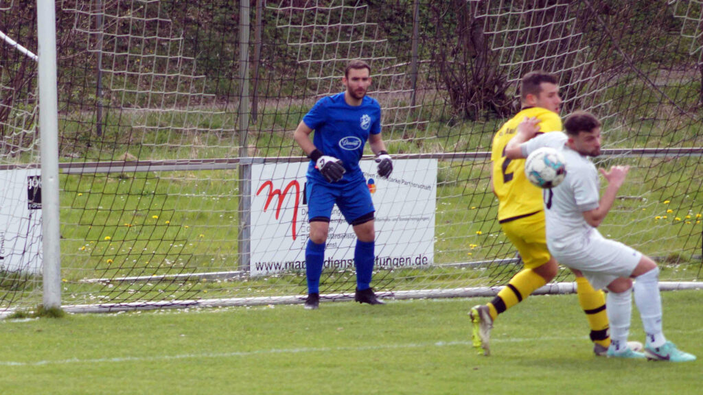 Gerangel vor dem Kasten der SGA: Aulendorfs Torwart Sebastian Ludwig muss nicht eingreifen.