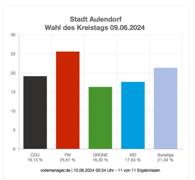 Aulendorf (rei) – Dem Wahlkreis 5 (Aulendorf-Altshausen) stehen 7 Sitze im Kreistag Ravensburg zu. Das Wahlkreisgebiet umfasst neben Aulendorf die Gemeinden das Gemeindeverwaltungsverbandes Altshausen. Im Bereich Aulendorf schnitt die CDU mit 19,1 Prozent außergewöhnlich schwach ab. Auch das Ergebnis der Grünen – trotz des Zugpferdes Bruno Sing – entspricht nicht den Erwartungen der politischen Beobachter und sicherlich nicht der einschlägigen Akteure. Bruno Sing selbst erhielt aber mit 2414 Stimmen ein starkes Ergebnis; das entspricht 46,7 Prozent aller grünen Kreistagsstimmen im Bereich Aulendorf (5171). Er dürfte damit sein Mandat verteidigt haben. Stärkste Liste bei der Aulendorfer Kreistagswahl ist die der Freien Wähler (25,6 Prozent). Das lag am Ergebnis von Bürgermeister Matthias Burth, der allein 4410 Stimmen holte, was 54,3 Prozent der 8126 FW-Stimmen bedeutet.
