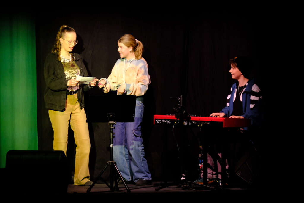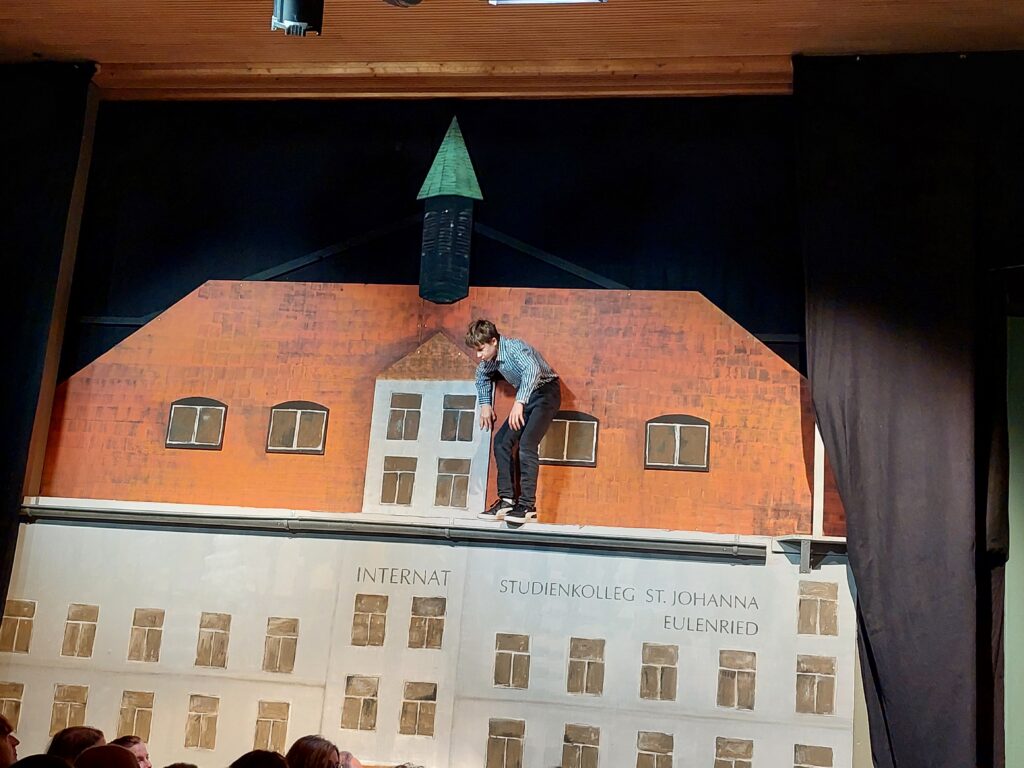 Das Schultheater des Studienkollegs St. Johann begeisterte die Kinder sowie ihre Lehrerinnen und Erzieherinnen mit seinem Können. Ein Lob geht auch an die Technik AG, die auch dieses Mal wieder mit ihrer Licht- und Tontechnik überzeugt hat. Das Publikum war beeindruckt von den Musikeinlagen zwischen den verschiedenen Szenen. Linus Schmidt und Annika Fügner zeigten hierbei ihr musikalisches Können, das sie auch schon in mehreren Schulgottesdiensten mit ihrer Schulband vorgeführt haben. Niklas Lengerer, der Matze Selbmann spielt, sprach schwäbisch und brachte damit die Zuschauer oftmals zum Lachen. Man merkte den Schauspieler:innen an, wie viel Spaß sie bei der Aufführung des Stückes hatten. Auch Sabine Egerlands, die von Julia Laux dargestellt wurde, schräge Interpretation von „Feliz Navidad“ erheiterte das Publikum. Als Uli von Simmern, der von Janosch Wehrmann verkörpert wurde, vom Dach sprang, war das Publikum geschockt. Dies war jedoch schnell wieder vergessen, als Hausmeister Ackermann, gespielt von Philipp Zimmermann, seine Witze zum Besten gab und alle wieder lachten. Bei der Weihnachtsszene waren die Zuschauer Feuer und Flamme und klatschten im Takt mit, es hielt fast niemand mehr auf den Stühlen und es gab „Standing Ovations“, obwohl das Stück noch gar nicht zu Ende war. Der ganze Saal verlangte lautstark nach einer Zugabe! Als die endgültig „letzte“ Szene gespielt war, merkte man den Anwesenden an, dass sie traurig darüber waren, dass die Aufführung zu Ende war und es wurde wieder lautstark geklatscht.