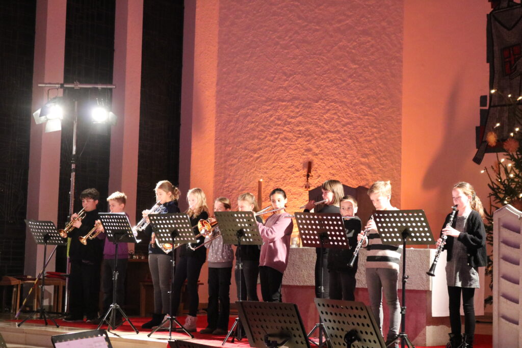 Selbst die Jüngsten von der Bläserklasse konnten bereits nach nur acht Wochen am Instrument mehrere Stücke zu Gehör bringen, dass es eine Freude war. Auch die Unterstufenband der Klassen 5 und 6 zeigten mit „Feliz Navidad“, welch große Fortschritte in kurzer Zeit möglich sind. Das Streicherensemble hatte da bereits mit einer Bläsergruppe für die feierliche Eröffnung des Abends gesorgt. Nun verkündete der Schulchor, der sich aus Unterstufenchor, Mittel- und Oberstufenchor, den Musikkursen sowie einigen Lehrerinnen und Lehrern zusammensetzt, von der Empore aus, dass er bereit für den Abend war: „I will sing“ ließ den Zauber der Adventszeit erklingen.