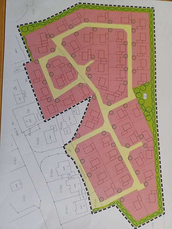 Um die inzwischen rechtskräftig gewordenen Vorgaben des Regionalverbandes Bodensee-Oberschwaben zu erreichen, wird vorgeschlagen die Anzahl der bisher ausgewiesenen 33 Bauplätze auf 50 Bauplätze zu erhöhen. Dies wird im Wesentlichen dadurch erreicht, dass die Bauplatzgrößen deutlich reduziert werden. Beispielhaft wäre folgende Bebauung möglich: