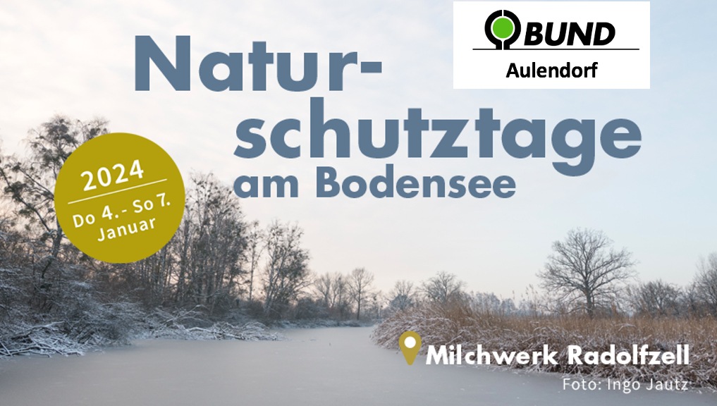 Aulendorf / Radolfzell – Vom 4. bis 7. Januar finden in Radolfzell Naturschutztage statt; Motto: „Ist unsere Welt noch zu retten?“ Es ist das größte Naturschutz-Event im deutschsprachigen Raum. Der BUND Aulendorf bietet eine gemeinsame, kostenlose Zug-Mitfahrgelegenheit ab Aulendorf nach Radolfzell am 6. Januar an: Abfahrt: 7.20 Uhr, Gleis 1, Bahnhof Aulendorf. Infos und Anmeldung beim Aulendorfer BUND-Vorsitzenden unter bruno.sing@bund.net oder 0173/6454673.