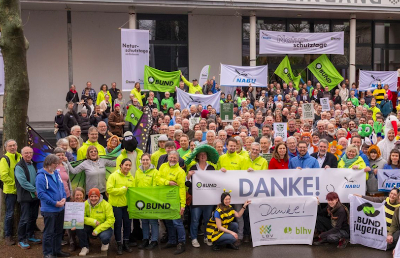 Der erfolgreiche Abschluss der Initiative „Ländle leben lassen“, der am Samstag (6. Januar) vor dem Veranstaltungsort Milchwerk mit einer Fotoaktion gefeiert wurde, zeigt für BUND und NABU, dass gemeinsam viel erreicht werden kann. „Wir sind viele tausend Aktive, jede und jeder Einzelne ist wichtig. Euer Engagement wirkt. Wir hoffen, dass die Übergabe der Unterschriften aus dem Volksantrag im Februar der Landespolitik den nötigen Schwung verleiht, um beim Flächenverbrauch die Netto-Null bis 2035 zu erreichen“, erklärten die Landesvorsitzende Sylvia Pilarsky-Grosch vom BUND und Johannes Enssle vom NABU.