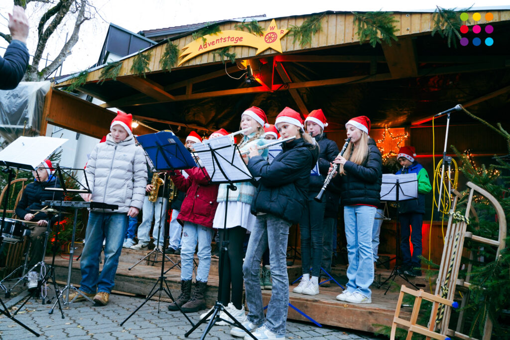 Bei wechselhaftem Dezemberwetter konnten sich die Besucher am Stand der Schule mit selbstgebackenen Plätzchen, kandierten Nüssen, Walnüssen und Selbstgebasteltem für die Vorweihnachtszeit eindecken. Der Erlös kam den Klassen 5 zugute. Beim traditionellen Kinderadvent am Sonntag traten die Bläserklassen 5 und 6 mit insgesamt 70 Schülern unter der Leitung von Christof Lang und Steffen Ocker auf.