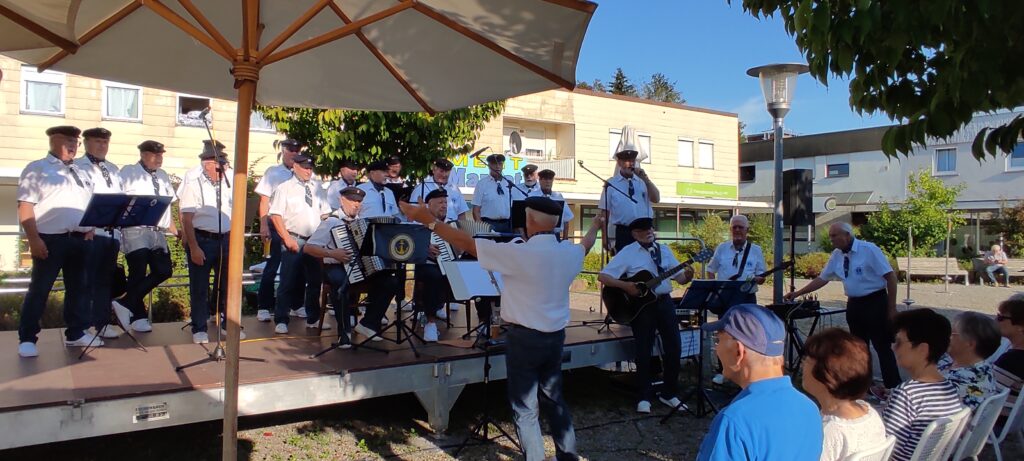 Aulendorf/Weingarten – Am 28. August gastierte der Marinechor Aulendorf bei der evangelischen Kirchengemeinde Weingarten. Bei strahlendem Sonnenschein und hochsommerlichen Temperaturen waren die Sitzplätze im Innenhof des Ladenzentrums im Nu belegt. Wer einen Sitzplatz im Schatten der Bäume ergattert hatte, konnte sich glücklich schätzen.