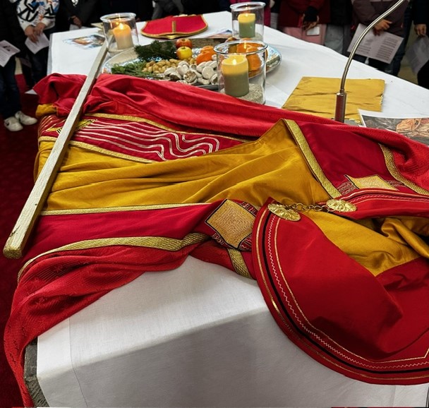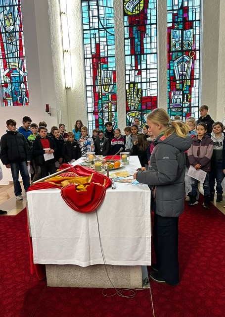 Zunächst versammelten sich alle 5er und auch Interessierte aus anderen Klassen in der Kirche. Dort wurde an die guten Taten des Heiligen erinnert und sein vorbildliches Gottvertrauen als beispielgebend auch für unsere Zeit gewürdigt. Besonders interessant fanden es die Kinder, die ausgelegten Kleider und Attribute des großen Heiligen aus der Nähe zu sehen und berühren zu dürfen.