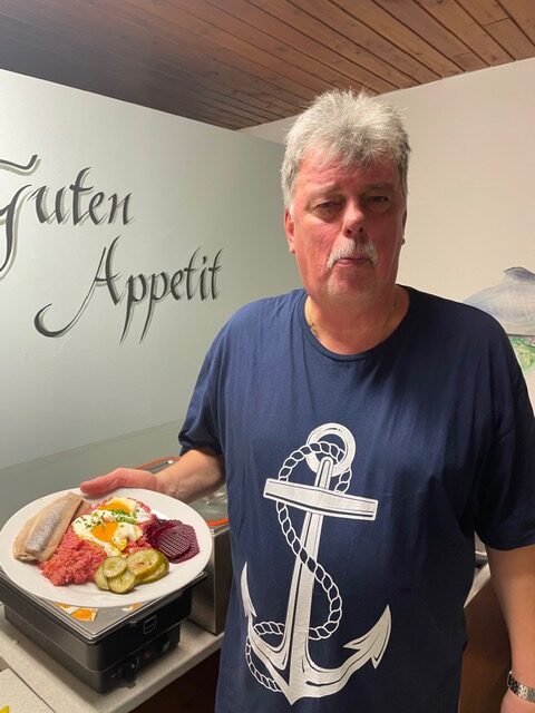 Lothar Sucharski, unser Smutje, ein waschechtes Nordlicht, hat sich bei seiner Labskauskreation jedenfalls keine Blöße gegeben und eine ganz besondere farbenreiche Köstlichkeit gezaubert, die mit großem Genuss verzehrt wurde. Nicht wenige bestellten sogar eine zweite Portion.