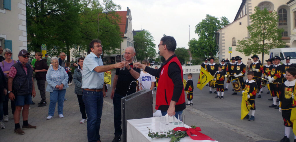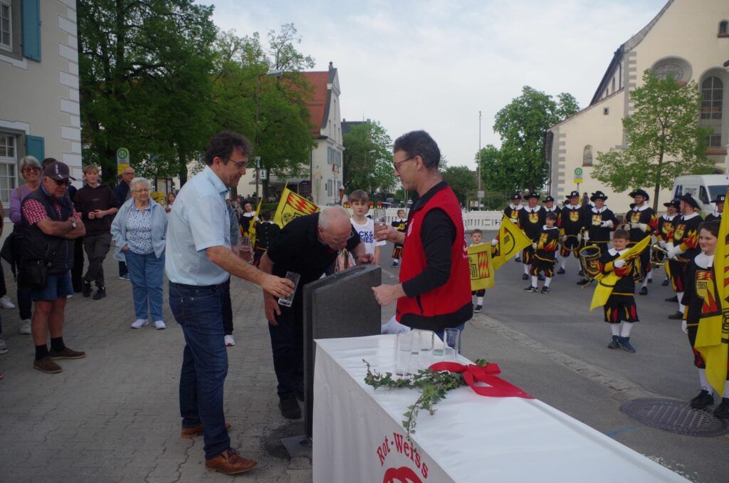 Die Einweihung des Trinkbrunnens fand im Rahmen des Maibaumstellens statt. Burth bedankte sich beim Fanfarenzug Aulendorf, der das Maibaumstellen und die Einweihung musikalisch umrahmten. Ein guter Grund sei, den Trinkbrunnen hier sichtbar an der Straße zu platzieren, denn die heißen Tage in den Städten werden immer mehr, so Burth weiter.