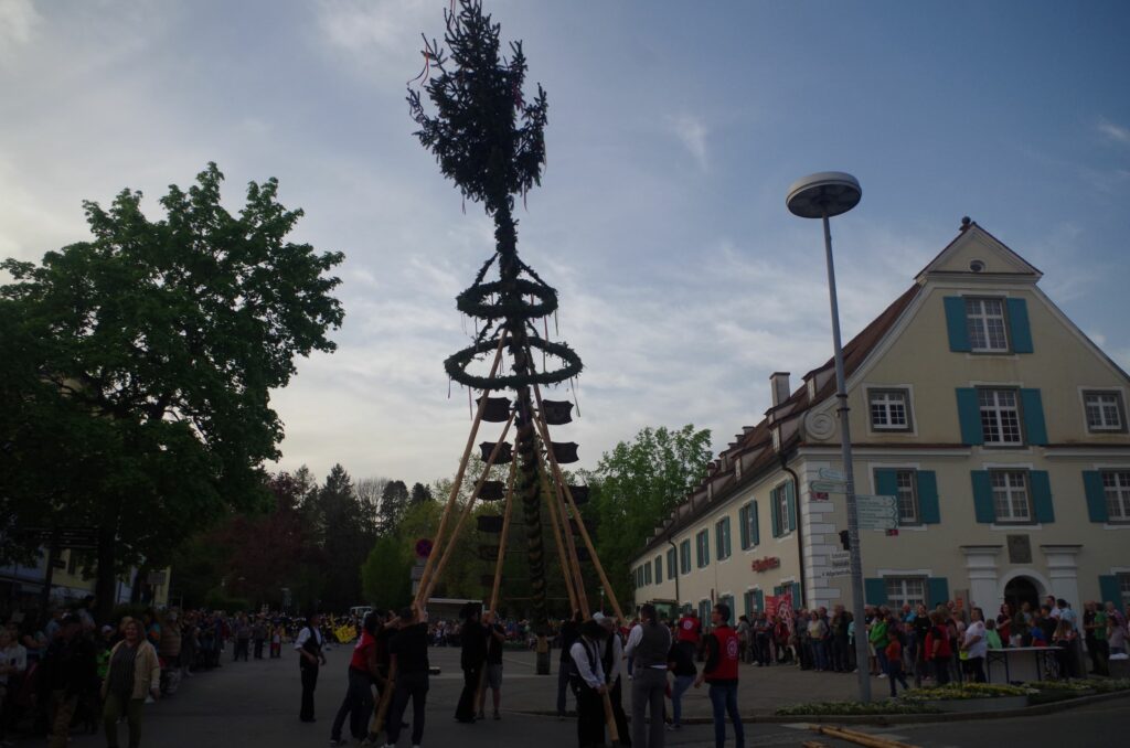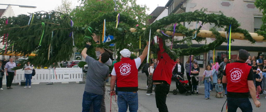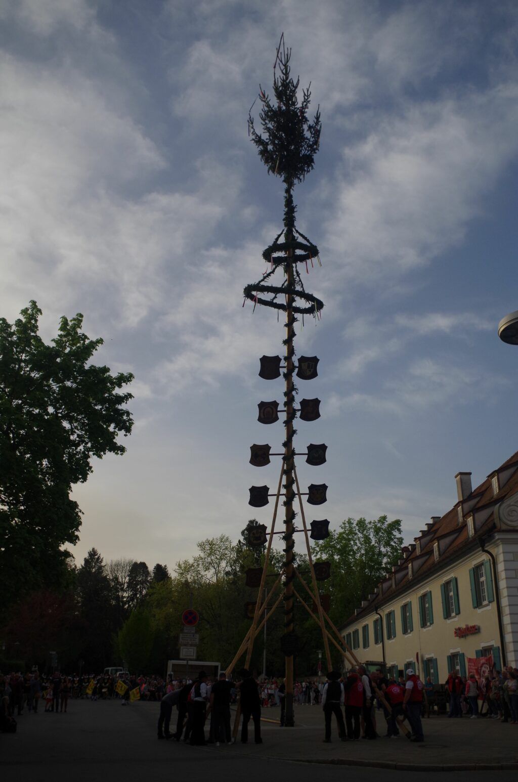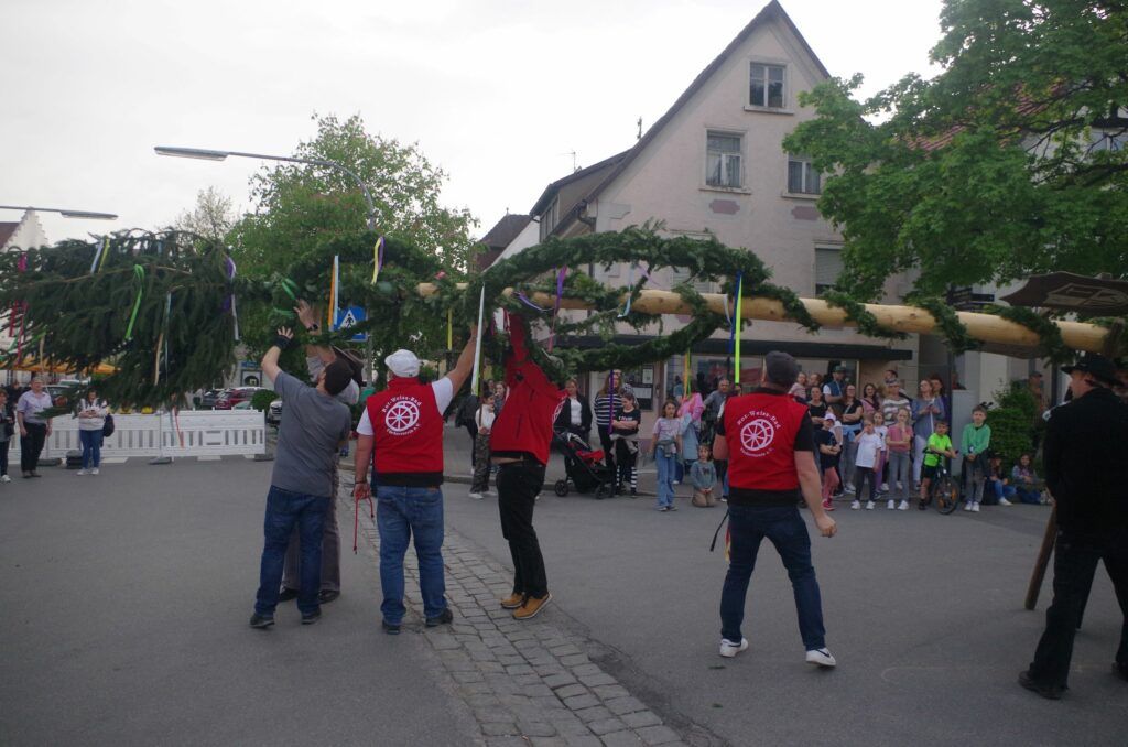 Starke Männer legen Hand an. Der Maibau wurde nach alter Väter Sitte aufgestellt.