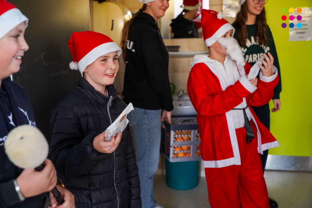 Unterstützt wurden sie von den charmant-wuseligen Weihnachtswichteln der SMV, bestehend aus Schülerinnen und Schülern der Klassen 9, 8 und 6. Und er hatte tolle Geschenke im Gepäck! Jeder Schüler und jede Schülerin bekam eine handverlesene personalisiertes Geschenktüte, in der sich schmackhafte – aber auch gesunde Geschenke – befanden. Ob das hilft, dass besser im Unterricht aufgepasst wird?