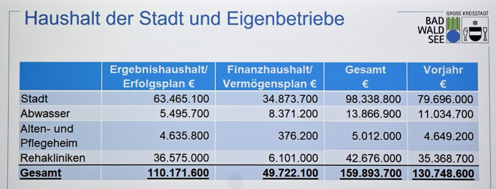 Bad Waldsee – OB Matthias Henne brachte in der Gemeinderatssitzung vom 4. Dezember im Haus am Stadtsee den Städtischen Haushalt ein (einschließlich Nebenhaushalte). Er umfasst einschließlich der Etats der Eigenbetrieben Rehakliniken, Altenheim Spital und Abwasser 159.893.700 € (Vorjahr: 130.748.600 €). Nun werden sich die Ortschaftsräte und Ausschüsse mit dem Zahlenwerk befassen. Die endgültige Beschlussfassung durch den Gemeinderat ist für den 29. Januar2024 vorgesehen.