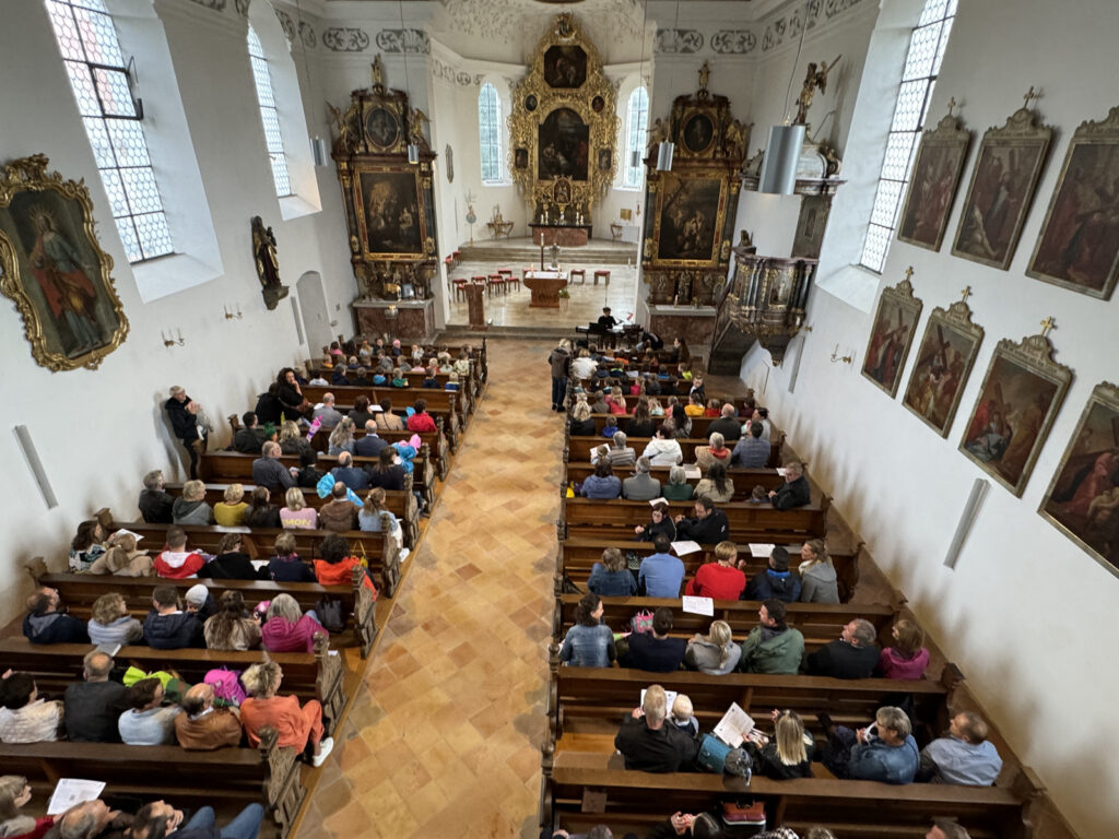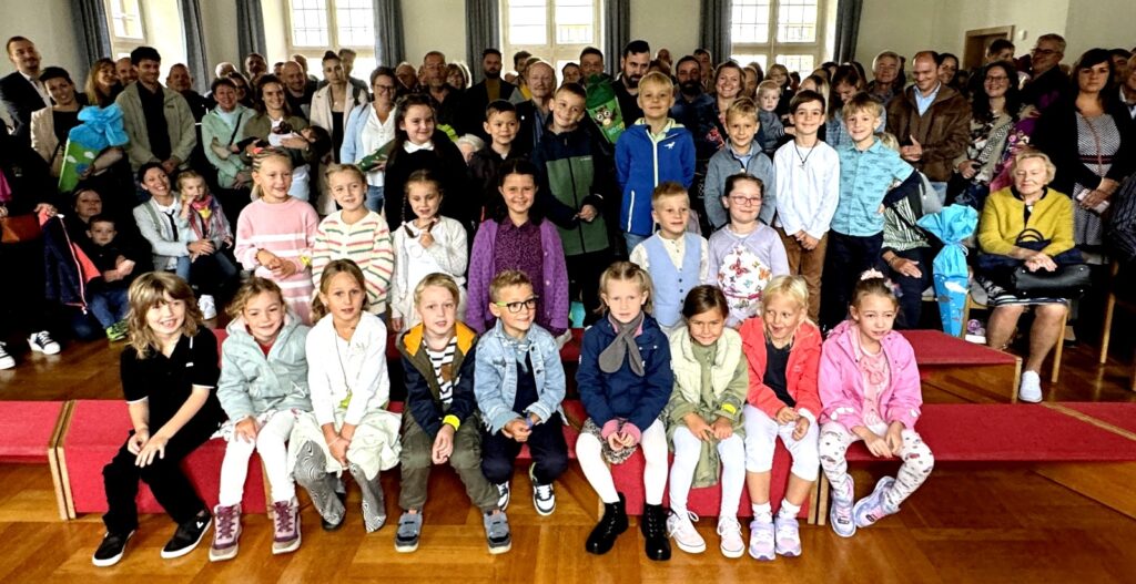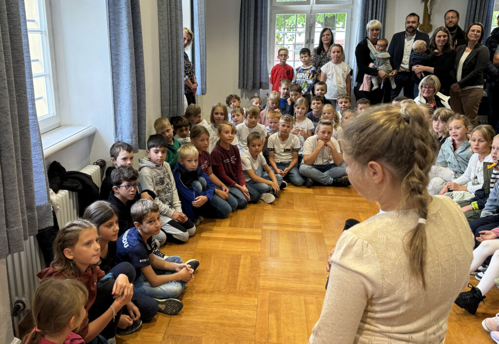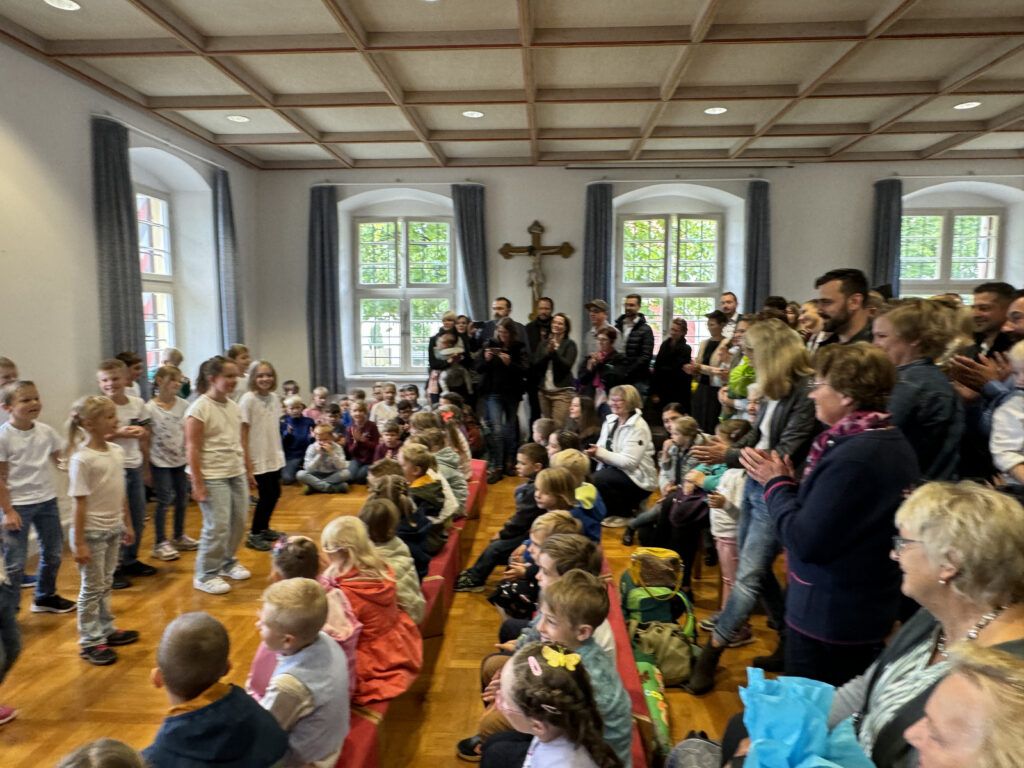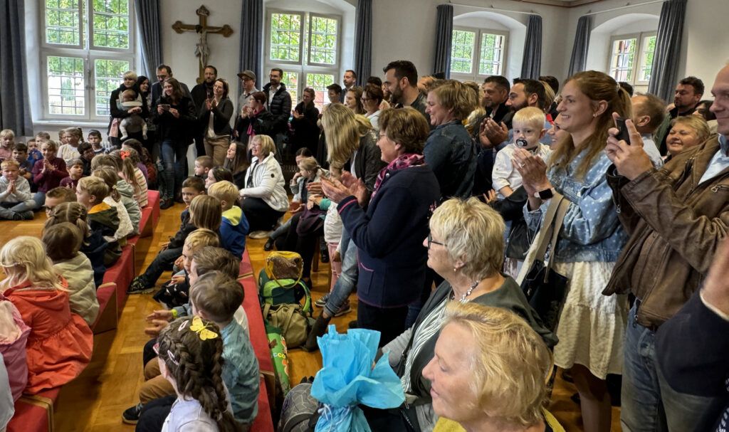 Der „weltliche Begrüßungsakt“ wurde dann fortgesetzt im Saal der Kirchengemeinde Haisterkirch. Den neuen Erstklässlern wurden in vorderster Reihe noch Bänke angeboten. Ansonsten musste mit Stehplätzen vorliebgenommen werden, denn so viele Menschen waren noch nie im Pfarrgemeindesaal versammelt, geschätzt über 150.