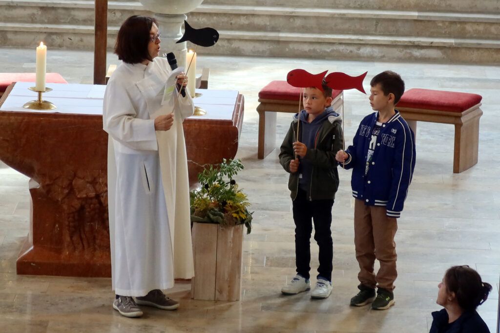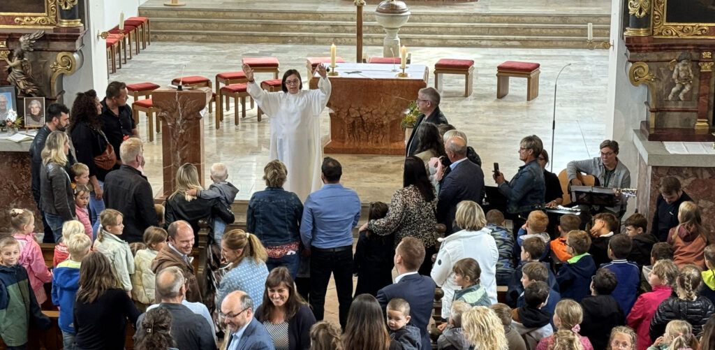 Gemeindereferentin Kathrin Bohnenberger (Bild) von der katholischen Seelsorgeeinheit Bad Waldsee leitete den ökumenischen Gottesdienst, der auf alle Gekommenen ausgerichtet worden war. Den Begrüßungsgottesdienst gestaltete Kathrin Bohnenberger lebendig, anschaulich und kindgemäß. Eltern, Lehrerinnen und Kinder wurden eingebunden in den Schulanfängergottesdienst. Eine ausgewählte Geschichte mit dem Fisch „Schwimmy“, der im großen Meer viele Begegnungen mit Tieren und Pflanzen hatte, verdeutlichte, dass nun im „Meer der Schule“ die Welt der Zahlen und Buchstaben sowie erlernbare Kenntnisse zu Mensch, Natur und Technik eine wesentliche Rolle spielen werden. „Dazu wünsche ich Euch Freude, Neugierde, Mut und denkt dann an die Worte von Jesus mit seinem Versprechen, dass er alle Tage bei Euch sein wird“, so der Wunsch der Gemeindereferentin, die dann die Eltern mit den Schulanfängern nach vorne bat und den Segen Gottes für alle erbat. Die passenden Lieder begleiteten Schulleiterin Angelika Zimmermann am Keyboard, Mesnerin Claudia Waibel mit Gitarren-Klängen und Schulpraktikant Lucas Hepp am Schlagzeug.