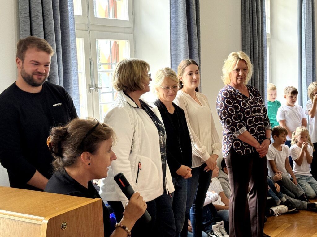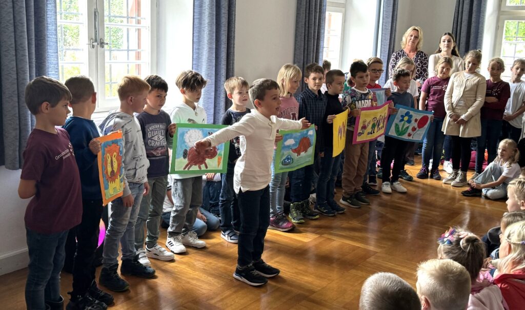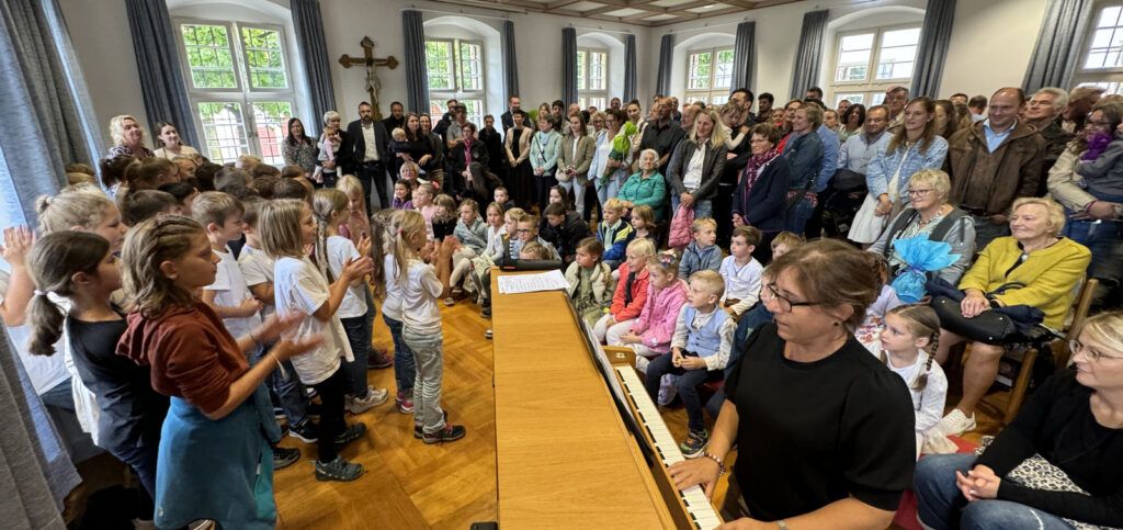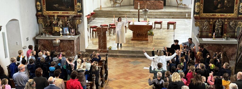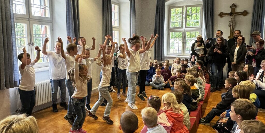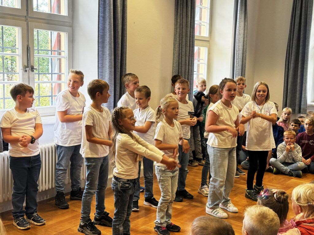 Mit gefälligen Liedern des Schulchors, harmonisch begleitet von der Schulleiterin Angelika Zimmermann am Klavier, wurde die Feier umrahmt. Die Zweitklässler waren voller Eifer dabei, den Neuen die Schule schmackhaft zu machen, ob mit Sprechvortrag zu den mitgebrachten Buchstaben oder mit bewegungsintensiven Tänzen und Spielrunden auch der Dritt- und Viertklässler. Die ganze Schulgemeinschaft nahm an dem überaus herzlichen Empfang teil. Großer, dankbarer Beifall wurde oft gespendet. Schulleiterin Angelika Zimmermann bedankte sich für die Gottesdienstgestaltung und die netten Programmbeiträge.